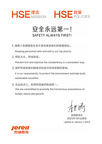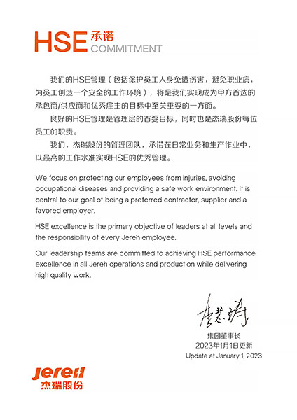 • At Jereh, HSE excellence is the primary goal of the management at all levels, as well as the responsibility of every employee.
