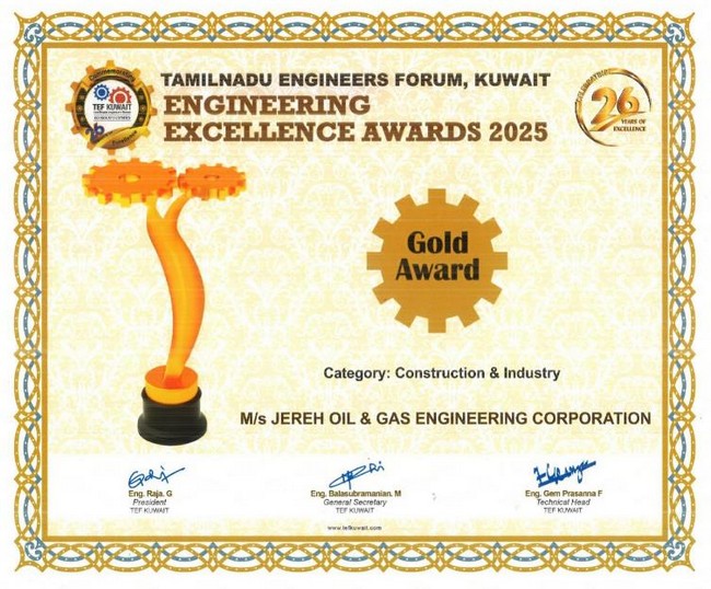 Align Oil & Gas Engineering Corporation received the Gold Award in the Construction & Industry category for the high-quality delivery of the Jurassic Production Facilities 5 (JPF-5) project for Kuwait Oil Company (KOC) at the 16th TEF Technological Innovations Conference & Exposition (TICE) and the 9th Engineering Excellence Awards Ceremony in Kuwait. The award, presented by senior representatives from KOC and Kuwait National Petroleum Company (KNPC), recognized Jereh’s excellence in project execution and delivery.
